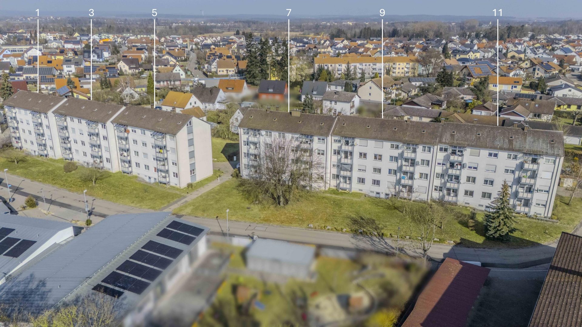 Die Mietshäuser wurden 1964 erbaut, jedoch wurden fast alle Wohnungen zwischen den 2000er Jahren und 2022 modernisiert. Für die Hausnummern 1, 3 und 5 liegt ein genehmigter Vorbescheid für den Anbau von drei zusätzlichen Gebäudeteilen im nordöstlichen Grundstücksbereich vor.