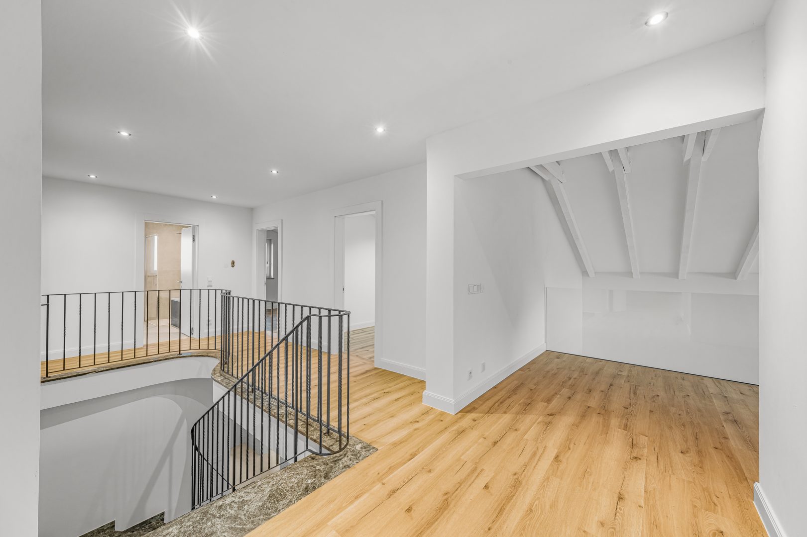 Über die elegante Steintreppe erreicht man die Galerie im Obergeschoss sowie fünf helle Zimmer, darunter ein Master-Schlafzimmer mit Loggia und zwei weitere Zimmer mit Zugang zur West-Loggia. Zwei moderne Bäder, eines davon mit Badewanne, vervollständigen das hochwertige Raumangebot.